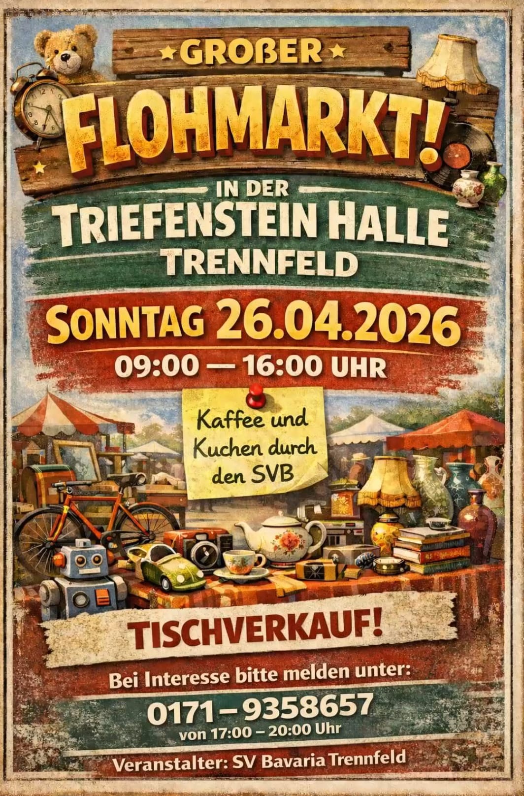 Am Sonntag, den 26.04.2026, veranstaltet der SVB einen großen Flohmarkt in der Triefenstein-Halle in Trennfeld.